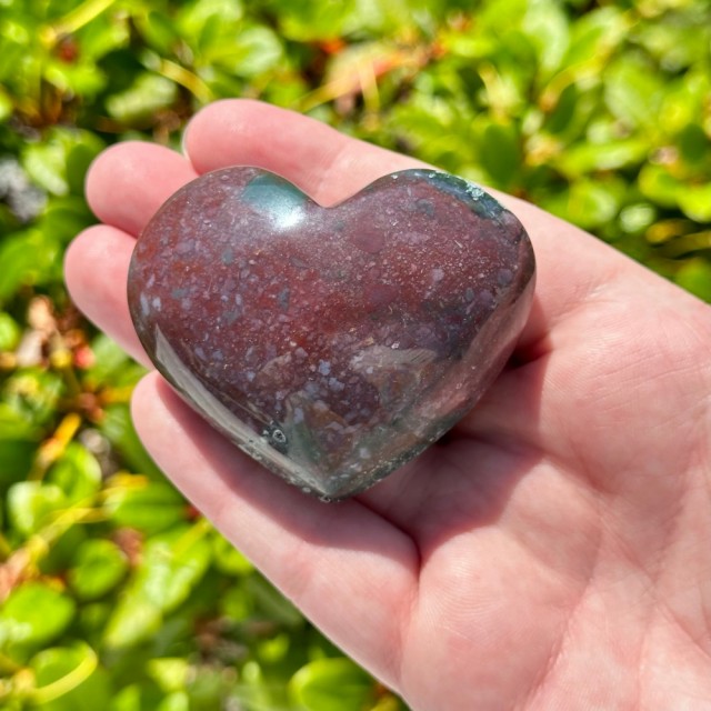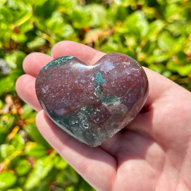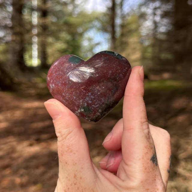 Sjø Jaspis hjerte. Dette er 4,8x5,6x2,9cm og veier ca 98,6g. Det er den krystallen du ser på bildene du får hvis du bestiller denne. Bildene er tatt i studiolys. OBS: Lite naturlig merke på tuppen, se bilde.