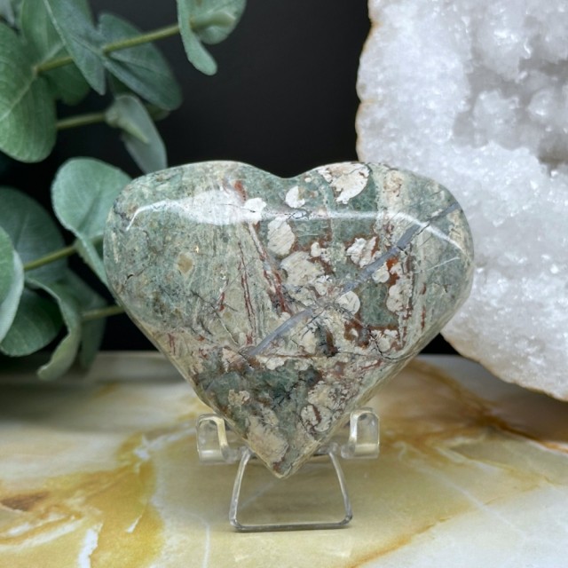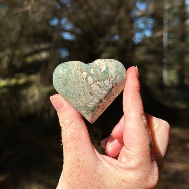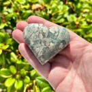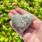 Rhyolitt Grønn Blomster Jaspis (Green Flower Jasper/Rhyolite) hjerte på 108g. ca 5,2x6,1x2,5cm.
