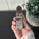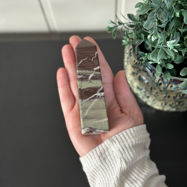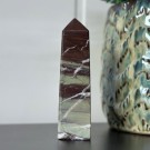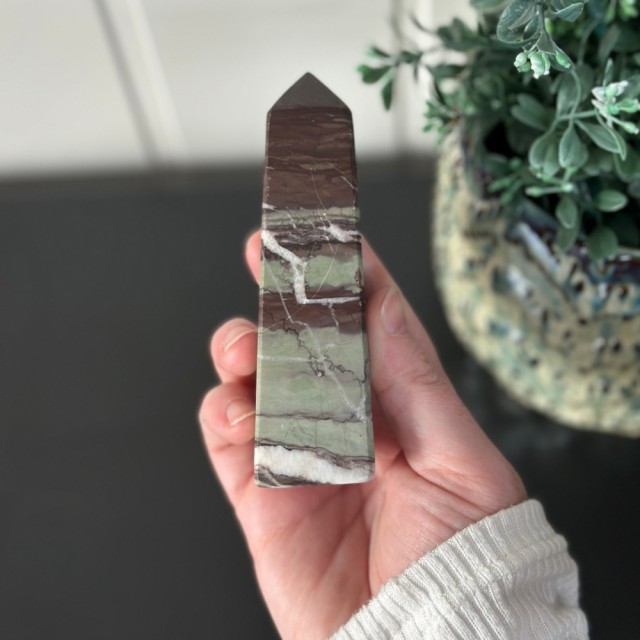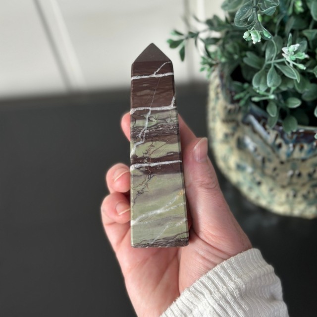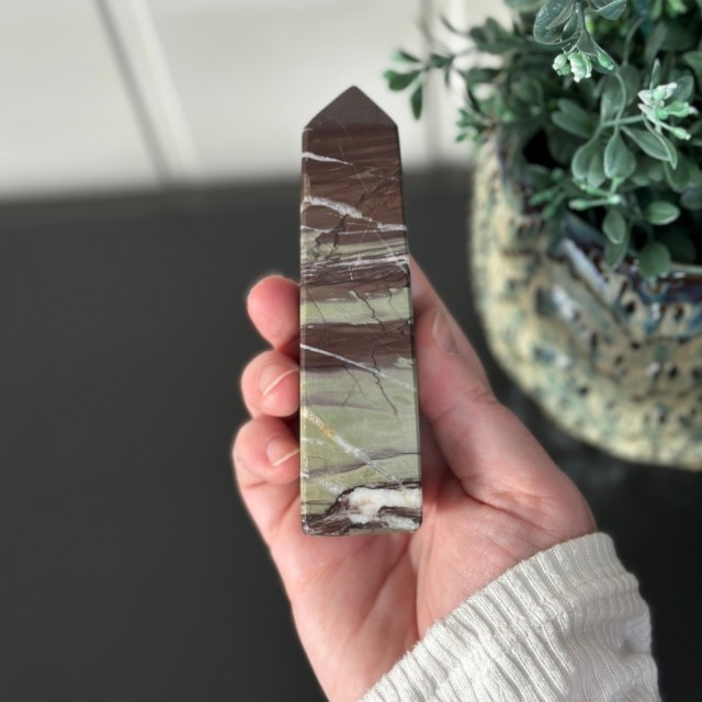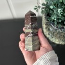 Candy Jaspis, en grønn og brun Jaspis fra Pakistan. Det hvite på krystallen er kvarts inneslutninger. Dette tårnet er 12cm høyt og veier ca 260g. OBS: miniatyr liten skade på toppen - kjøpt sånn.