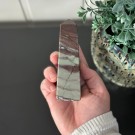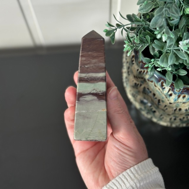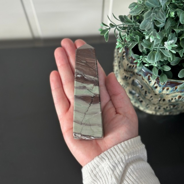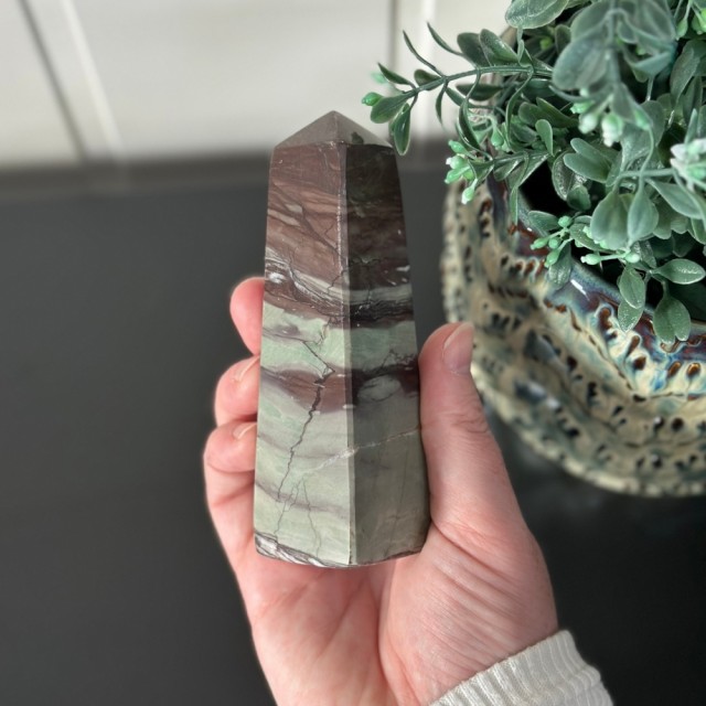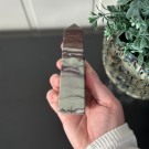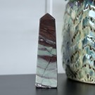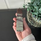 Candy Jaspis, en grønn og brun Jaspis fra Pakistan. Det hvite på krystallen er kvarts inneslutninger. Dette tårnet er 11,8cm høyt og veier ca 288g.