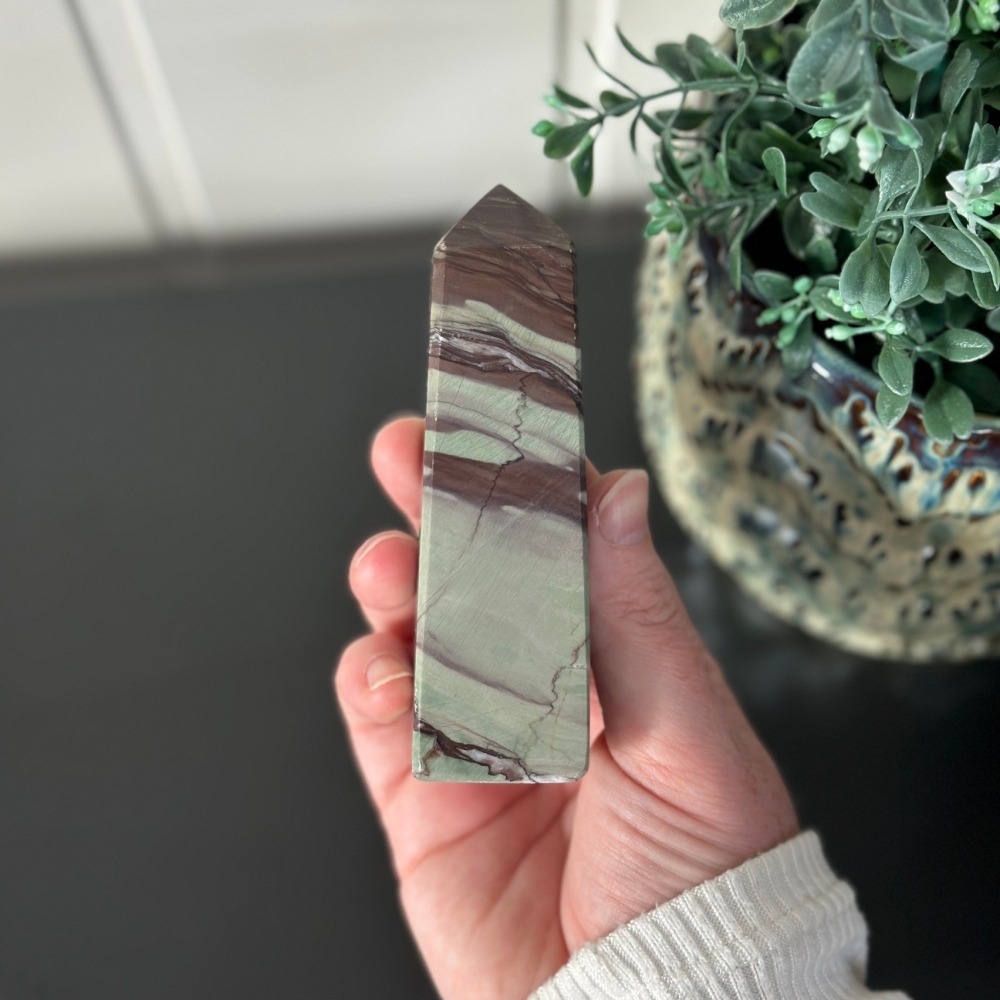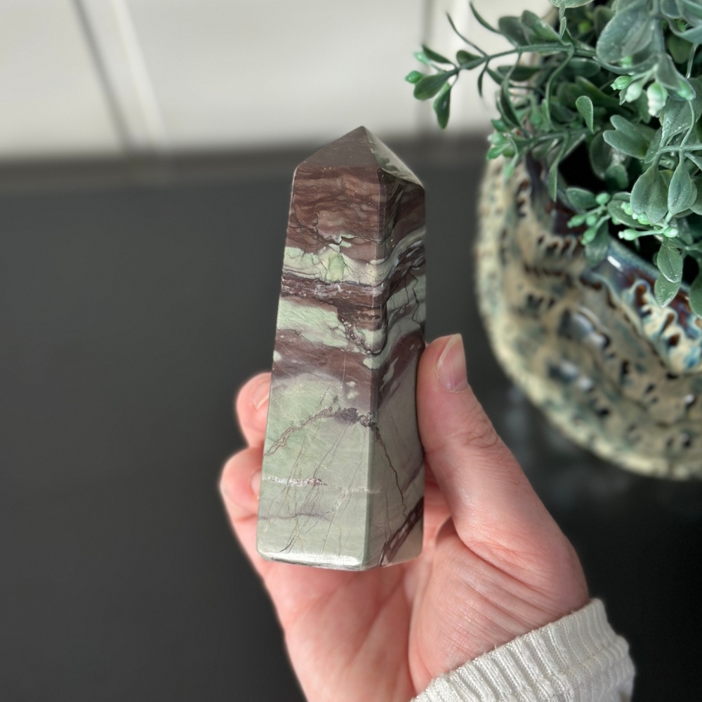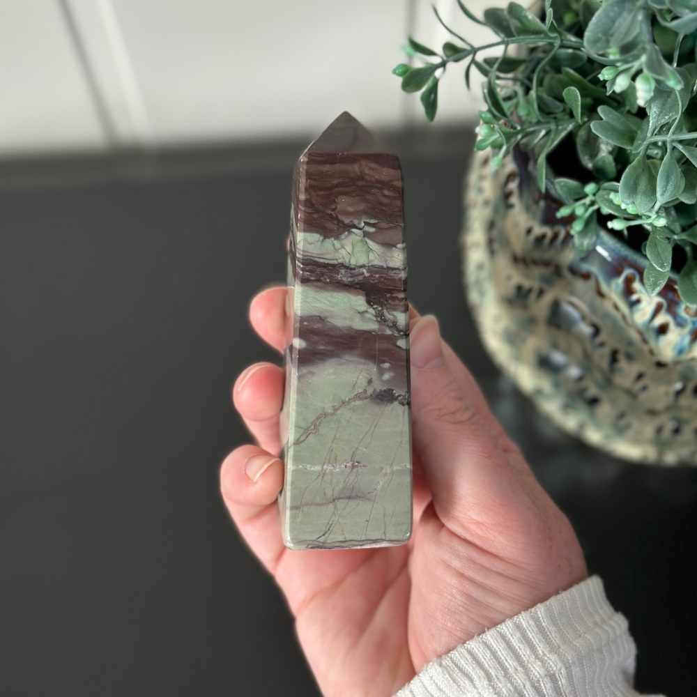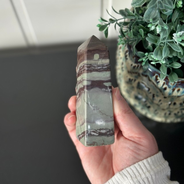 Candy Jaspis, en grønn og brun Jaspis fra Pakistan. Det hvite på krystallen er kvarts inneslutninger. Dette tårnet er 12cm høyt og veier ca 260g. OBS: miniatyr liten skade på toppen - kjøpt sånn.