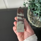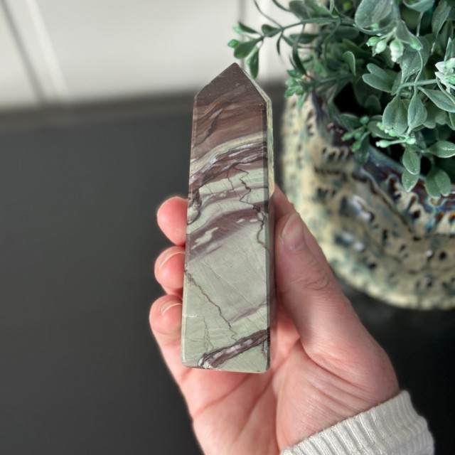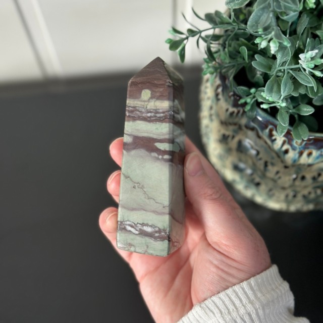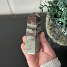 Candy Jaspis, en grønn og brun Jaspis fra Pakistan. Det hvite på krystallen er kvarts inneslutninger. Dette tårnet er 11,8cm høyt og veier ca 288g.