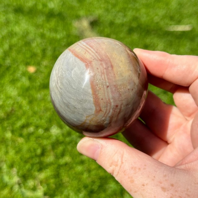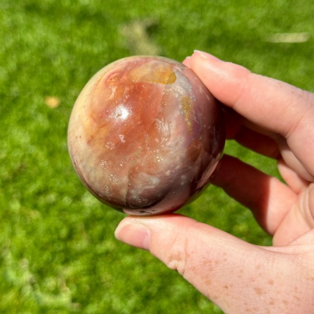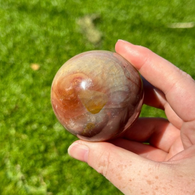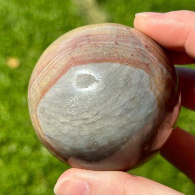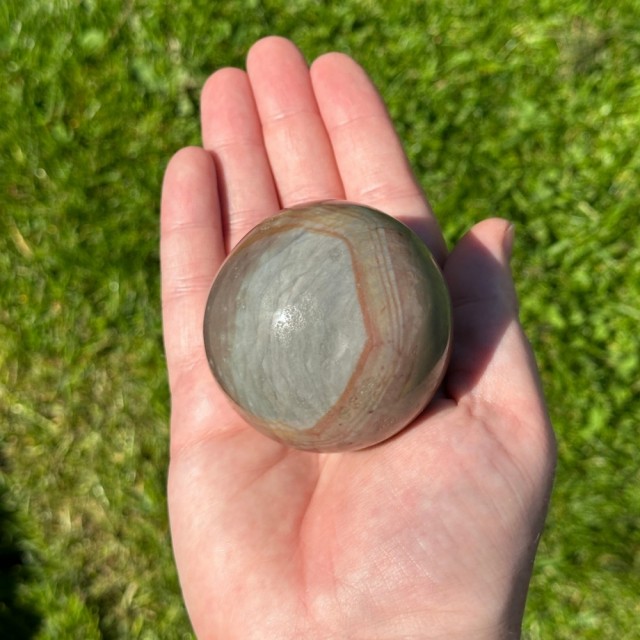 En vakker Grønn & Gul Fluoritt kule på 5cm og 215g. Med en lilla stripe som tilfører mystikk og harmoni. Symbol på balanse, klarhet og livsglede.