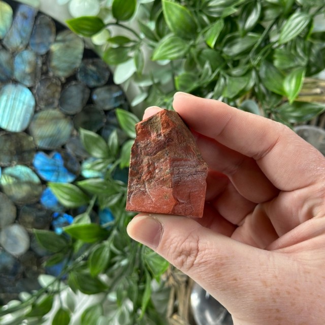 Renser og stabiliserer auraen. En stein av helse, Rød Jaspis sies å styrke og avgifte sirkulasjonssystemet, blod og leveren.