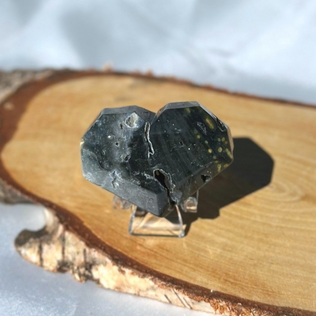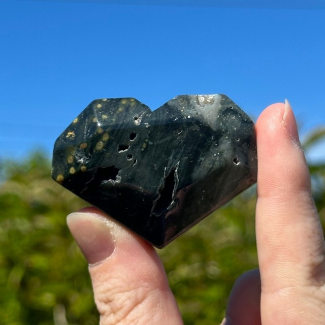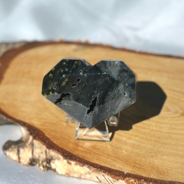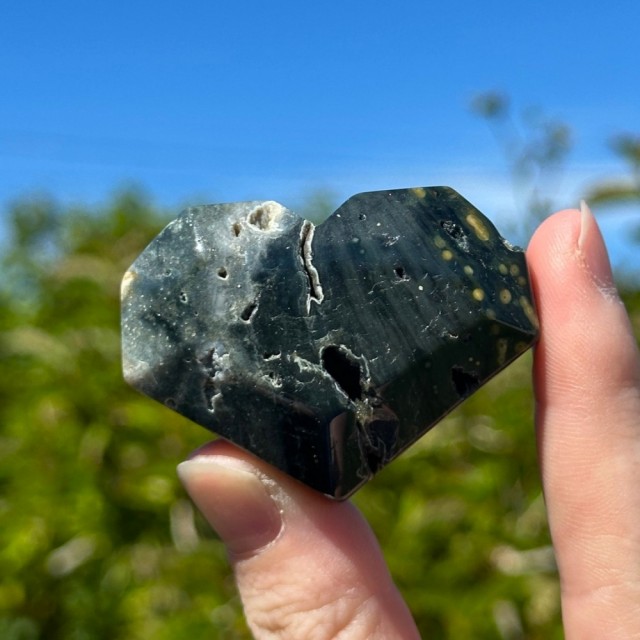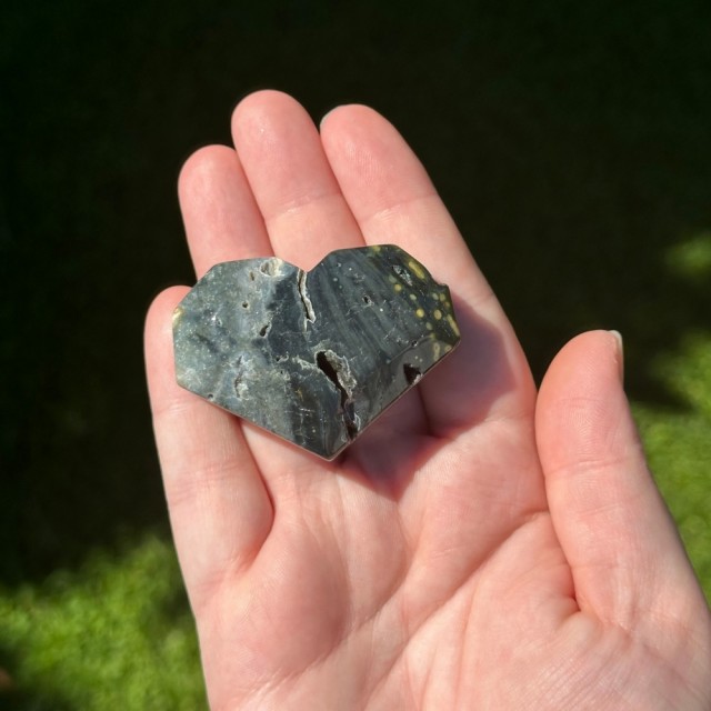 Nydelig lite faceted Orbikulær Sjø Jaspis hjerte. Dette veier ca 63g og er 3,8x5,2x2,2cm. Det er den krystallen som vises på bildene du får hvis du bestiller denne.