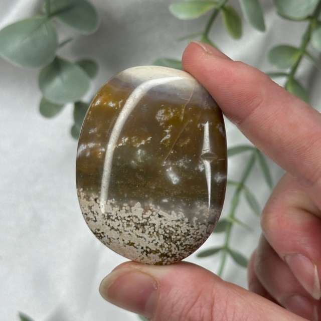 Orbikulær Sjø Jaspis håndstein på 5,7cm og veier ca 65g. Det er den på bildene du får hvis du bestiller denne.