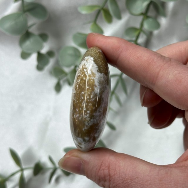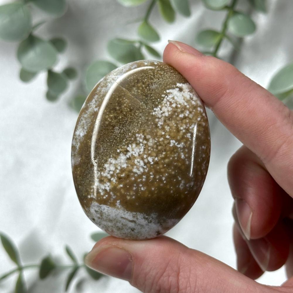 Orbikulær Sjø Jaspis håndstein på 5,7cm og veier ca 65g. Det er den på bildene du får hvis du bestiller denne.