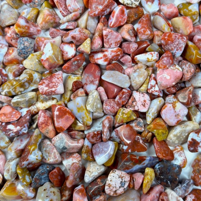 Polykrom Jaspis tromlet fra Madagaskar. Disse er ca 2,5-4,5cm lange. Se bildene for en mer nøyaktig størrelse informasjon. Små naturlige merker forekommer.