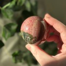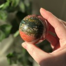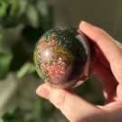 Orbikulær Sjø Jaspis håndstein på 5cm og veier ca 49g. Det er den på bildene du får hvis du bestiller denne. Denne har litt mer brunlige farger enn det kommer frem på bildene (tatt i studiolys)