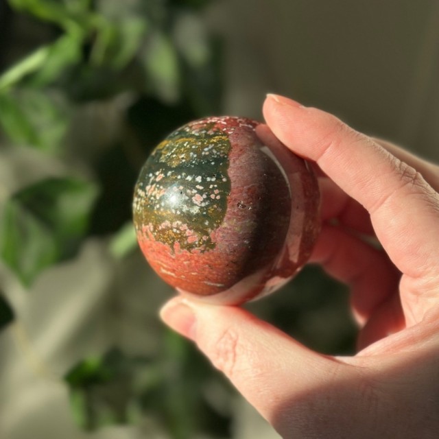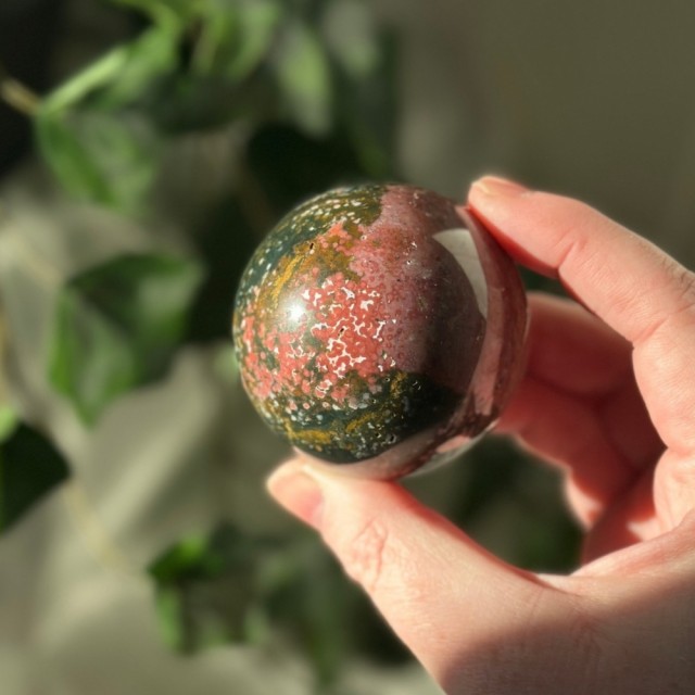 Orbikulær Sjø Jaspis bærer havets rytme i seg - en krystall for ro, balanse og emosjonell healing. De vakre sirklene minner oss om livets sykluser og vår indre styrke. Denne veier ca 934g og har målene 12,4x9,1x5,1cm. Naturlige merker forekommer.