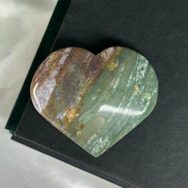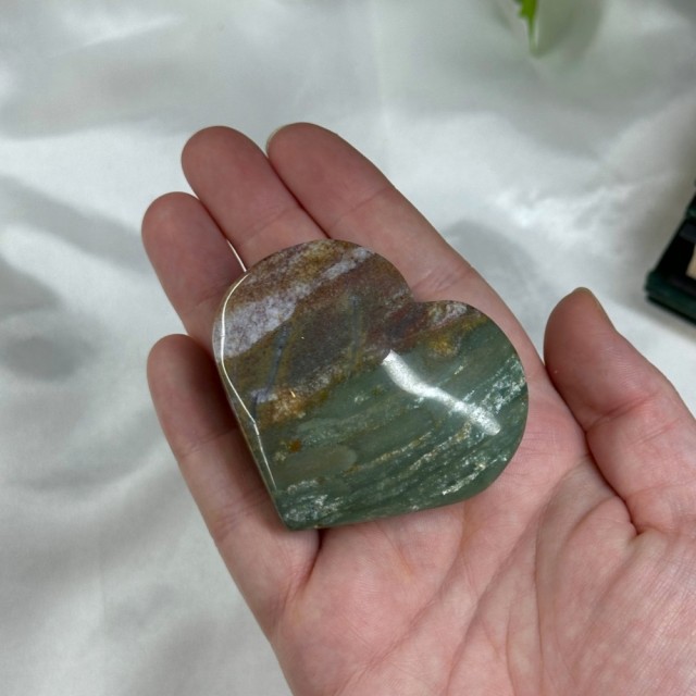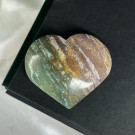 Sjø Jaspis hjerte. Dette er 5,4x6,2x2,4cm og veier ca 100g. Det er den krystallen du ser på bildene du får hvis du bestiller denne. Bildene er tatt i studiolys.