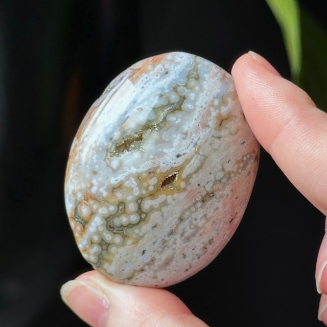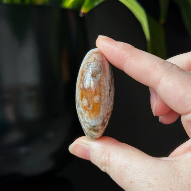 Orbikulær Sjø Jaspis håndstein på 5cm og veier ca 50g. Det er den på bildene du får hvis du bestiller denne.