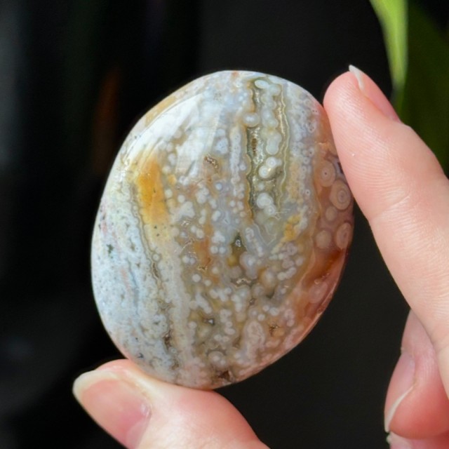 Orbikulær Sjø Jaspis håndstein på 5,3cm og veier ca 59g. Det er den på bildene du får hvis du bestiller denne.