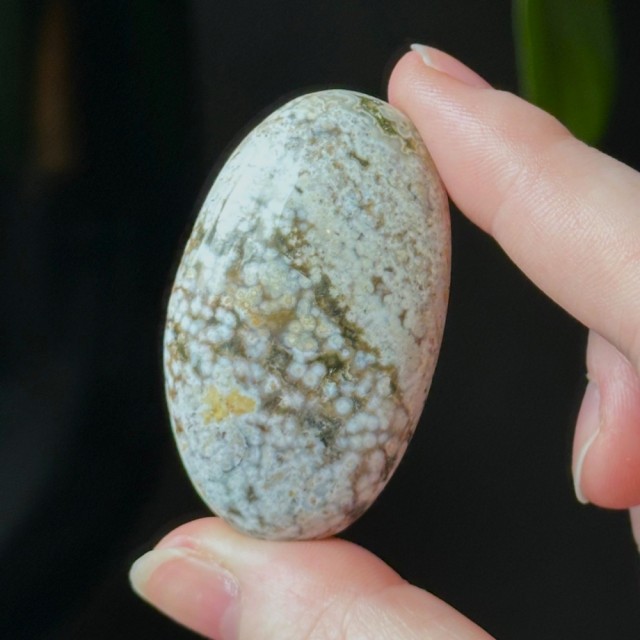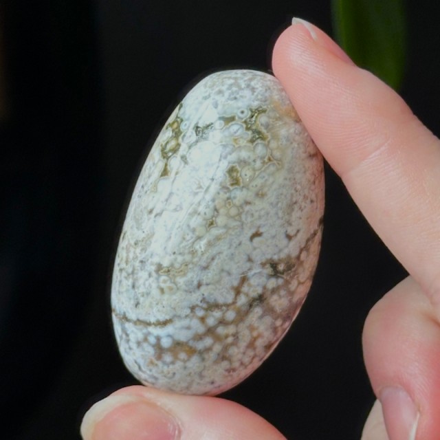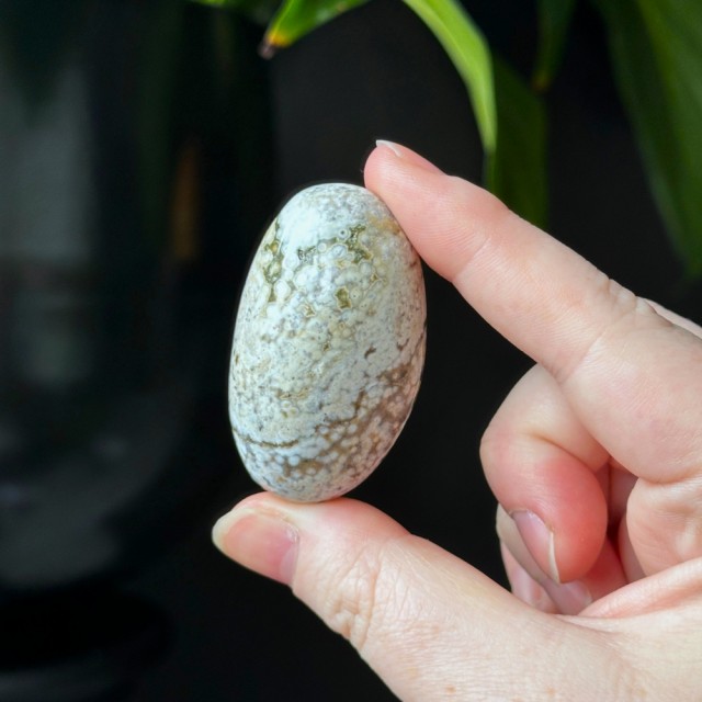 Nydelig Sjø Jaspis håndstein. Denne er 5,1cm lang og veier ca 45,5g. Det er den på bildene du får hvis du bestiller denne. Vær obs på at minimale små merker kan forekomme. Bildene er tatt under dagslys, produkt kan avvike fra bildene. Se nøye før kjøp.