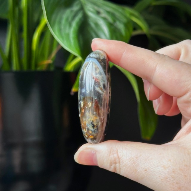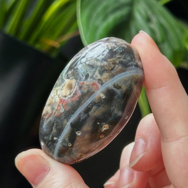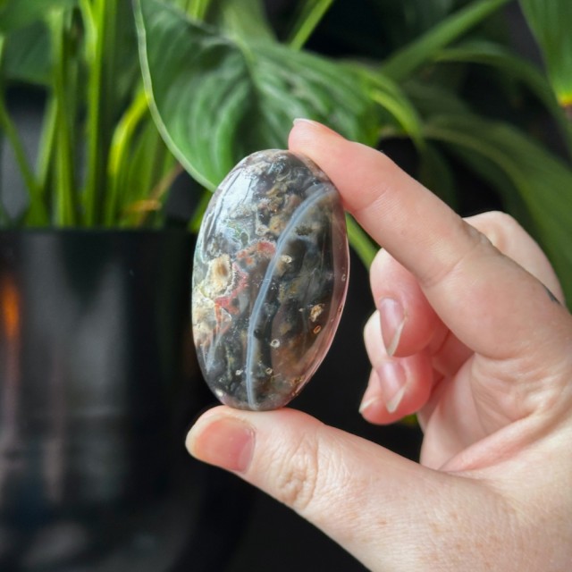 Orbikulær Sjø Jaspis håndstein på 4,4cm lang og veier ca 49g. Det er den på bildene du får hvis du bestiller denne.
