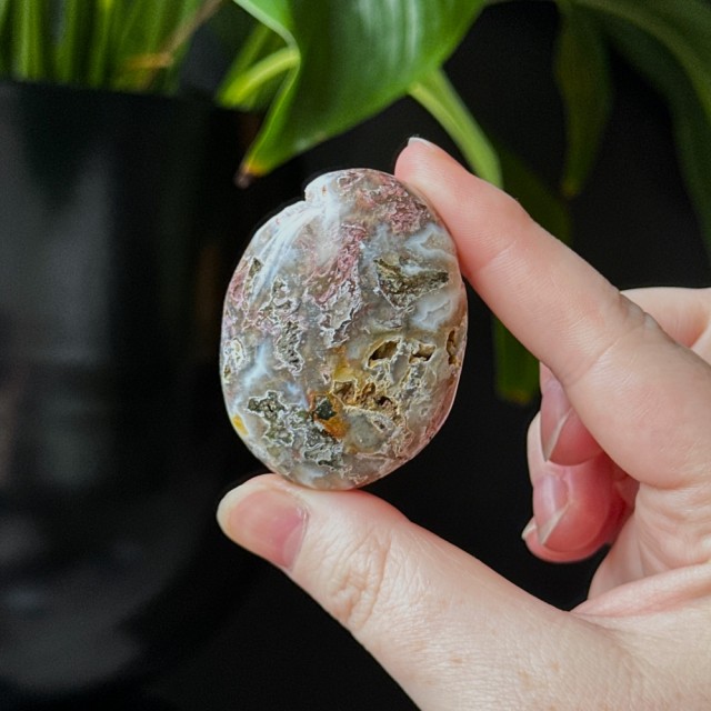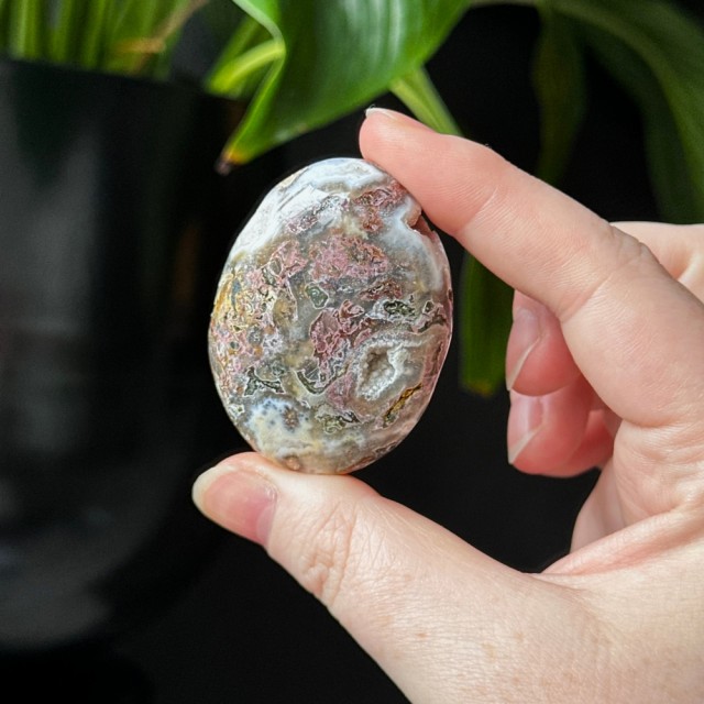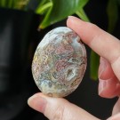 Orbikulær Sjø Jaspis håndstein på 5cm og veier ca 50g. Det er den på bildene du får hvis du bestiller denne.
