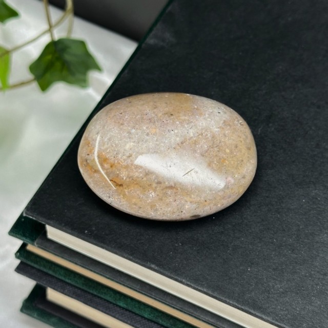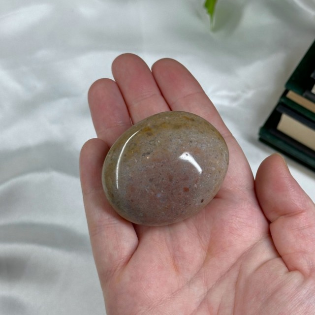 Sjø Jaspis håndstein. Denne er 5,3x4,3x2,7cm og veier ca 78g. Det er den krystallen du ser på bildene du får hvis du bestiller denne. Bildene er tatt i studiolys.