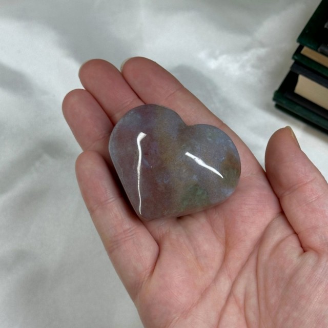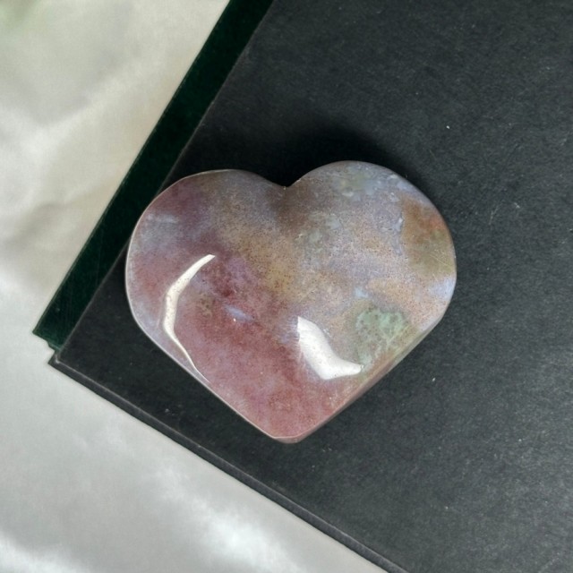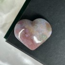 Sjø Jaspis hjerte. Dette er 4,5x5,3x2,6cm og veier ca 80g. Det er den krystallen du ser på bildene du får hvis du bestiller denne. Bildene er tatt i studiolys. OBS: Små merker kan forekomme.