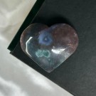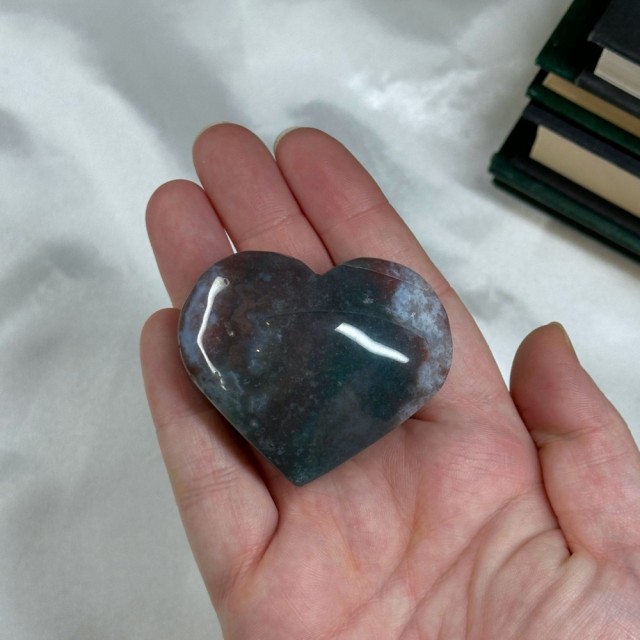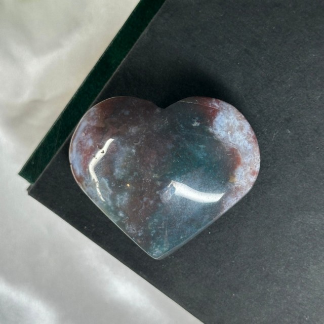 Sjø Jaspis hjerte. Dette er 4,8x5,5x2,7cm og veier ca 86g. Det er den krystallen du ser på bildene du får hvis du bestiller denne. Bildene er tatt i studiolys. OBS: Små merker forekommer.