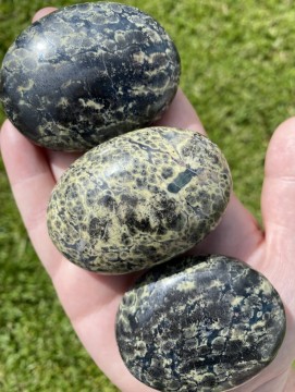Denne iøynefallende steinen er overveiende mørkegrønn i fargen med vakre svarte flekker og virvler.