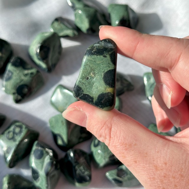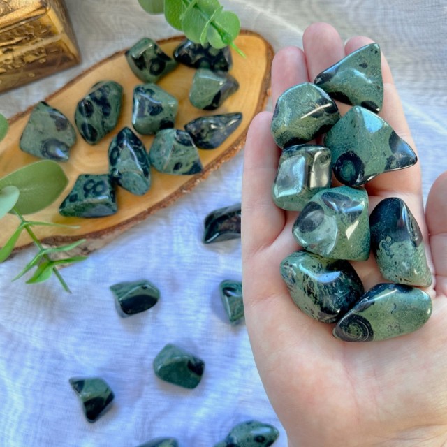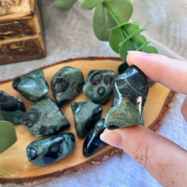 Kambaba Jaspis krystallen er primært funnet på Madagaskar i den vestlige sentrale Bongolava-regionen, og er en kraftig krystall med et bredt spekter av helbredende egenskaper. Det er en fascinerende stein med virvler av mørkegrønn farge og uregelmessige flekker av svart farge.