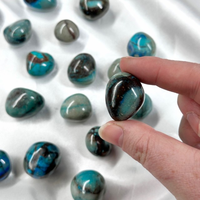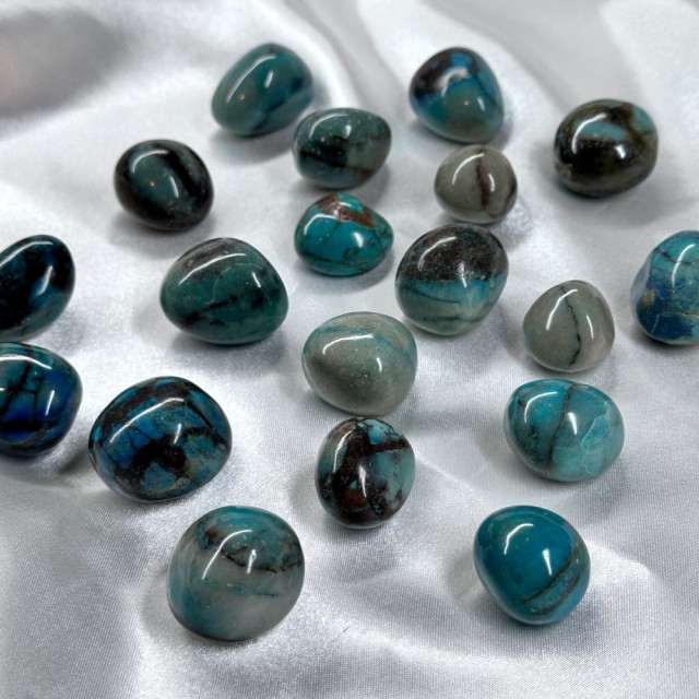 Krysokolla fra Madagaskar - en vakker krystall for indre ro, balanse og kommunikasjon. Perfekt for healing, meditasjon og å styrke kjærlighet til seg selv. En unik stein med beroligende, jordende energi. 50g per pose, ca 12-20stk - 1-2cm.