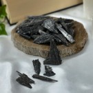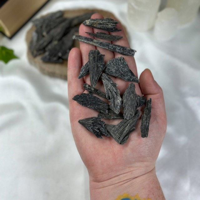 Svart Kyanitt råflak. OBS: Disse er tynne og skjøre. Kan splintre lett, vær forsiktig. Prisen er per stk. Størrelse vil variere, da disse selges vekt vis. Selges enkeltvis men kan forekomme 2 stk i en pakke hvis vekten blir for liten med en stk.