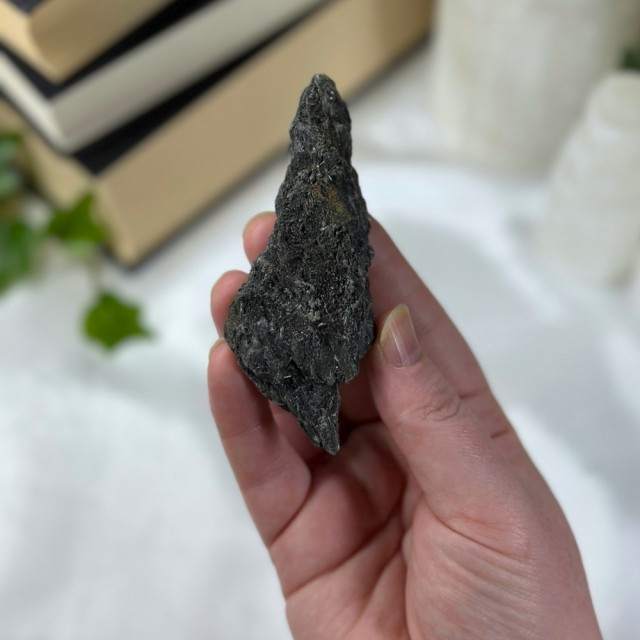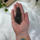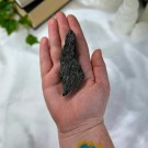 Svart Kyanitt råflak. OBS: Disse er tynne og skjøre. Kan splintre lett, vær forsiktig. Det er den krystallen du ser på bildene du får hvis du bestiller denne. Denne råbiten her veier ca 68,9g og er 9,8cm lang.