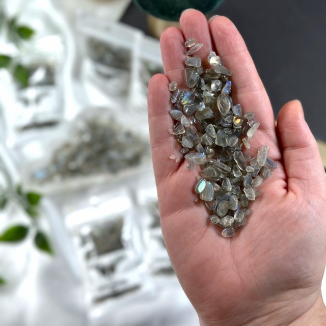 Regnbue Månestein (også kjent som hvit labradoritt) er en favoritt blant samlere – elsket for sitt blå glimt, iriserende skinn og sterke tilknytning til månesykluser og indre visdom. Disse er ca 2-3cm. Alle har flash-garanti, tilfeldig hvor mye.
