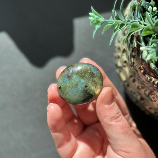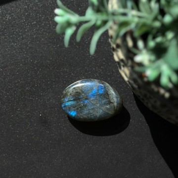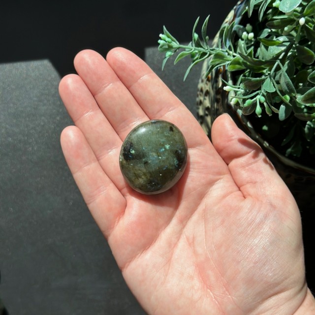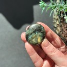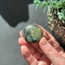 Flashy liten Labradoritt håndstein. Denne er 4,7x3,2x1,5cm og veier ca 36g. Naturlige merker forekommer! Det er denne krystallen du ser på bildene du får hvis du bestiller denne.