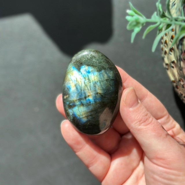 Flashy Labradoritt håndstein. Denne er 6,5x4,4x1,7cm og veier ca 77g. Naturlige merker forekommer! Det er denne krystallen du ser på bildene du får hvis du bestiller denne.