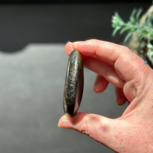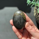 Svart Månestein (Black Moonstone) håndstein på 56g og har målene 5x4,3x1,9cm. Små merker forekommer.