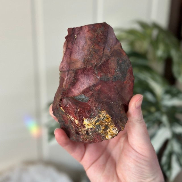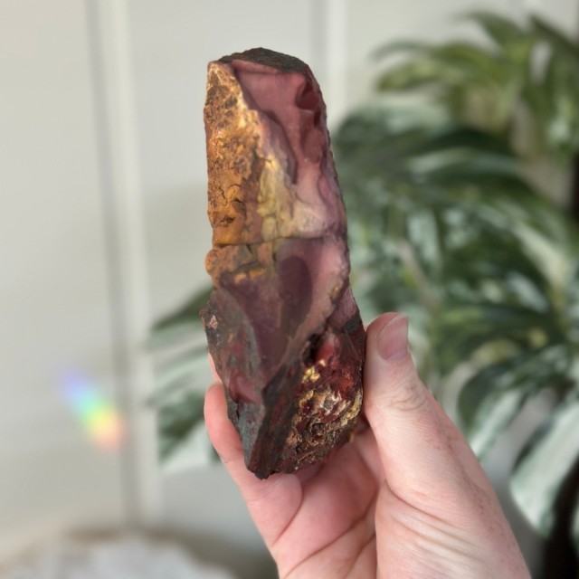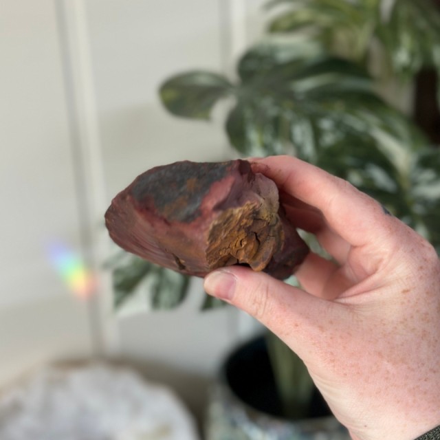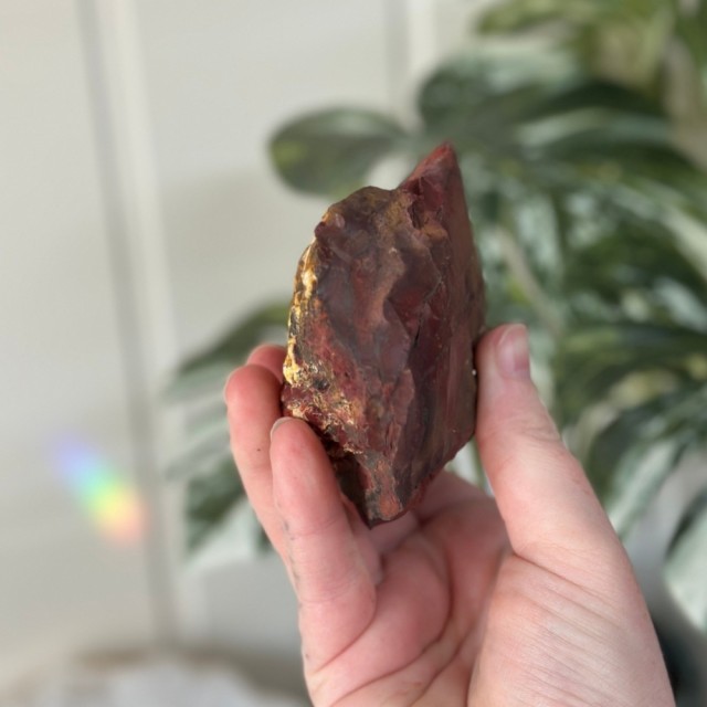 Mokait Jaspis råbit på hele 394g. Denne råbiten du ser på bildene er den du får hvis du bestiller denne. Omtrentlig mål er 9x7,7x5,8cm.