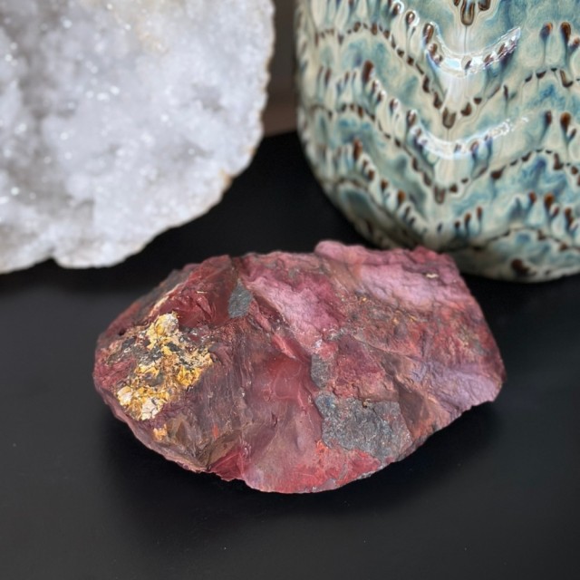 En av hovedårsakene til at Bumblebee Jaspis er så dyr, er at den er vanskelig å samle. Siden Mount Papandayan er en aktiv vulkan, må gruvearbeidere reise inn i et farlig miljø for å samle disse krystallene. Denne er 7,4cm høy og veier 92g. Har en råside.
