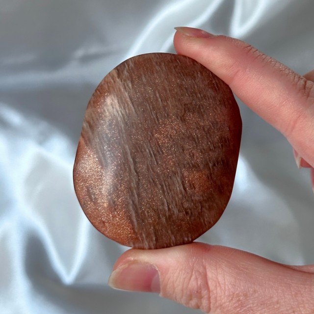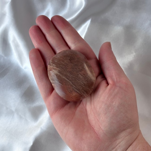 Fersken Månestein med Solstein (Peach Moonstone & Sunstone) håndstein. Denne er 5,8x4,7x1,9cm og veier ca 88g. Små merker forekommer.