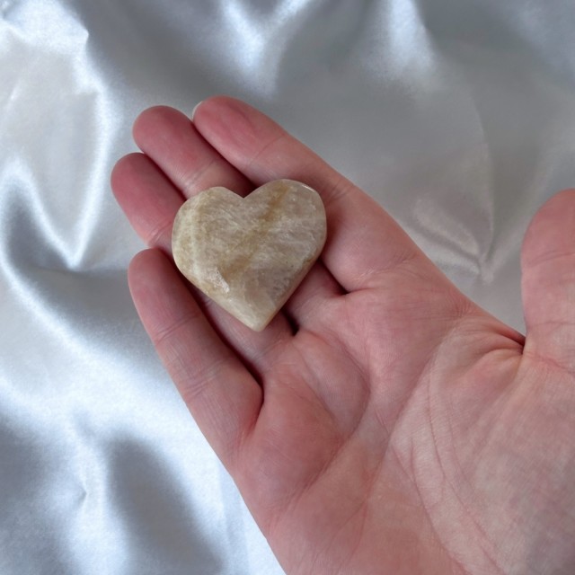 Oransje Bånd Kalsitt hjerte. Dette veier ca 96,7g og har målene 6,3x7,3x1,1g.