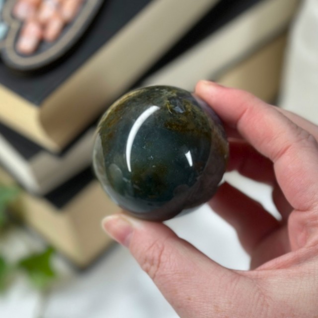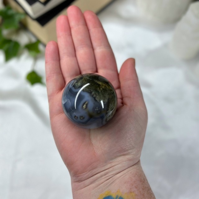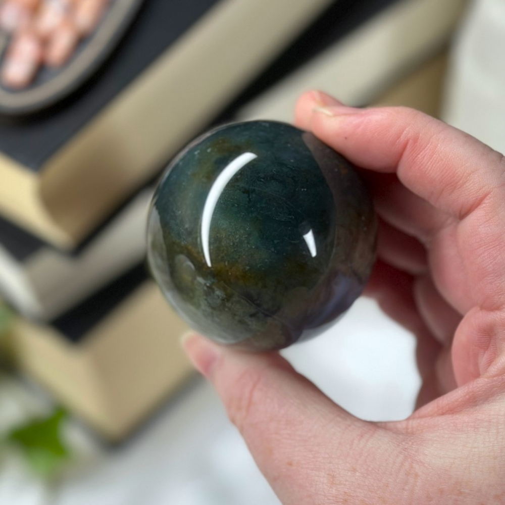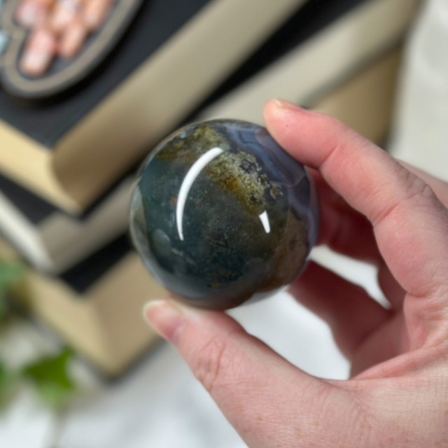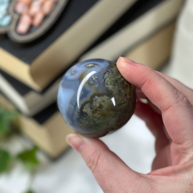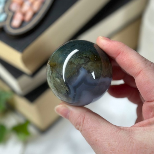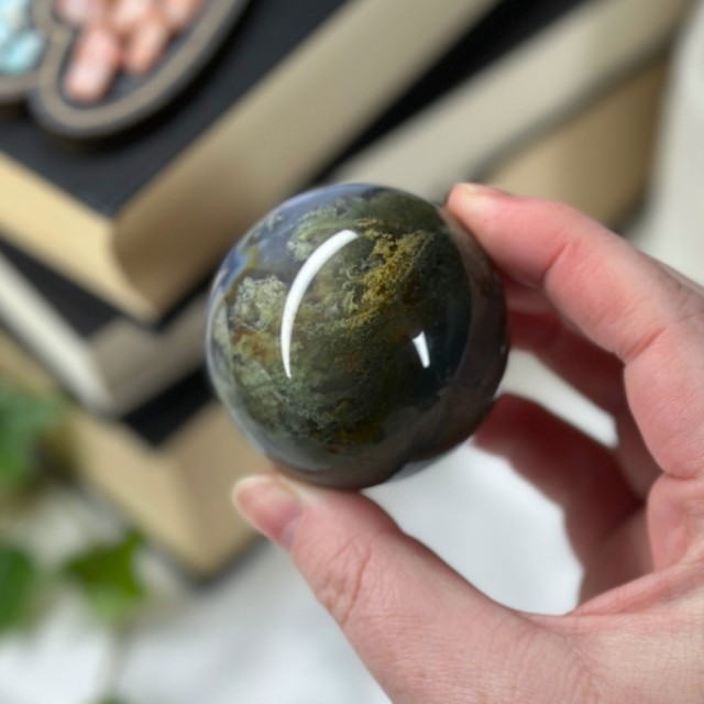 Små Mose Agat kuler på 2cm. Prisen er per stk og det vil bli tilfeldig plukket ut til deg. Alle disse er ganske mørke i fargen.