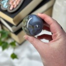 Nydelig grå Agat måne, dette har pittelitt drusy på seg samt litt dendritt (små prikkene). Dette er 5,4x3,9x1,2cm og veier ca 40g. Det er den krystallen på bildene du får hvis du bestiller denne. PS: Små naturlige merker forekommer på disse Agatene.