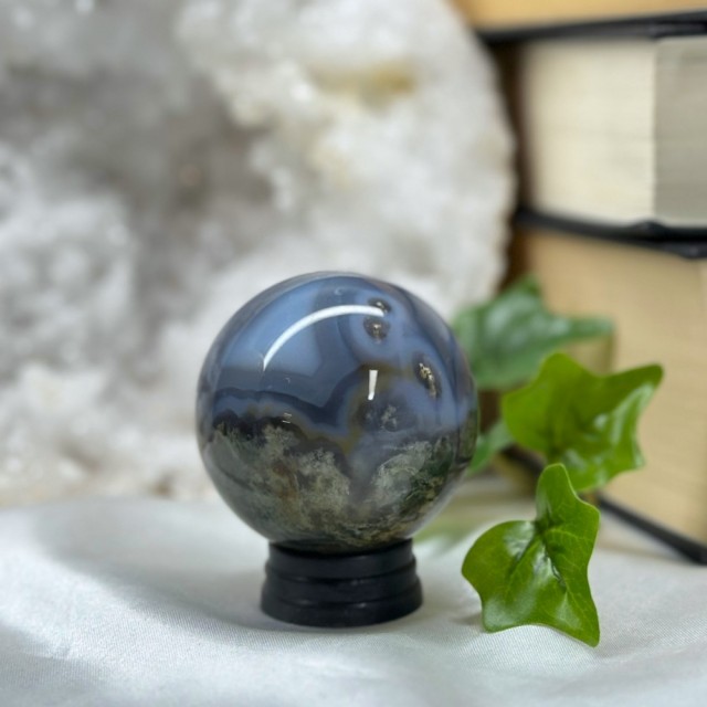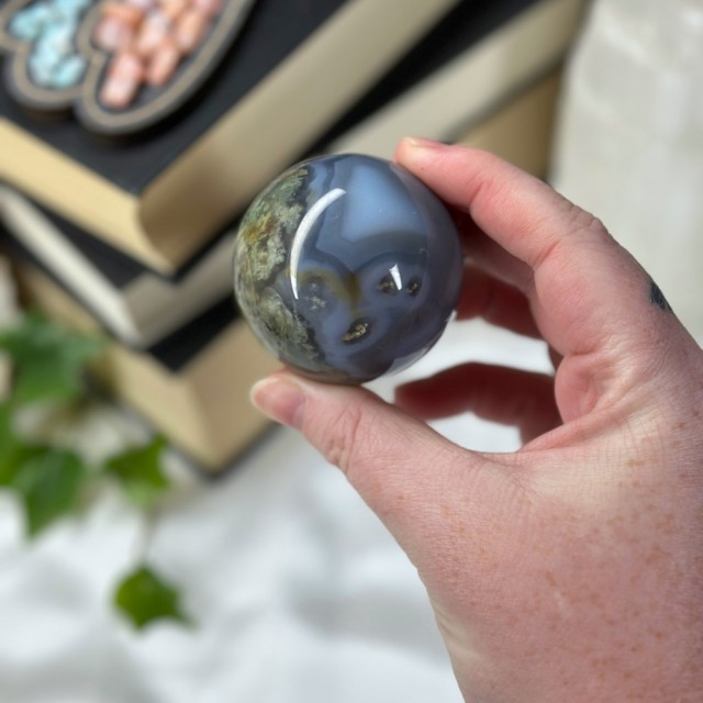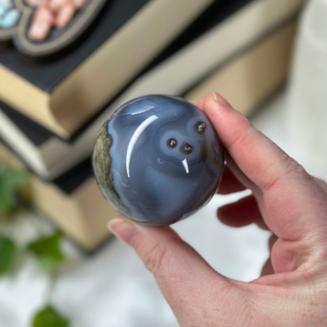 Orca Agat, også kalt Spekkhoggerstein, er en vakker krystall for indre ro, tilgivelse og selvaksept. Den myke blå-hvite energien minner om havets helbredende kraft og spekkhoggerens styrke. Dette er 6,3x6,9x2,7cm og veier 154g. Naturlige merker forekommer