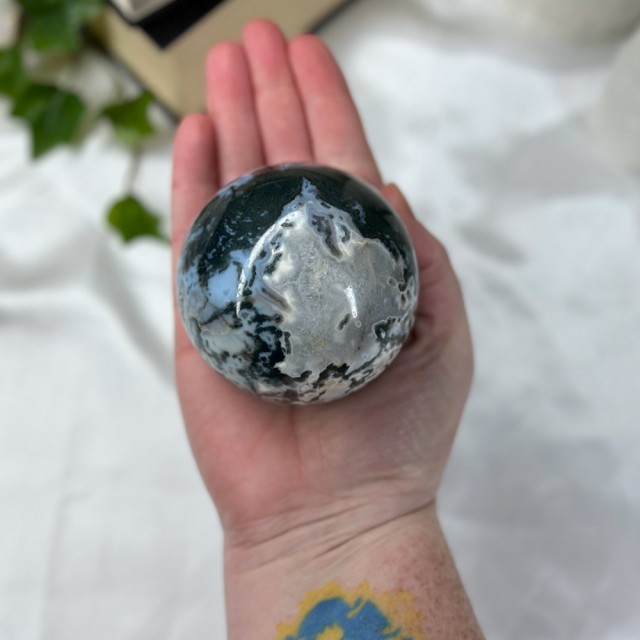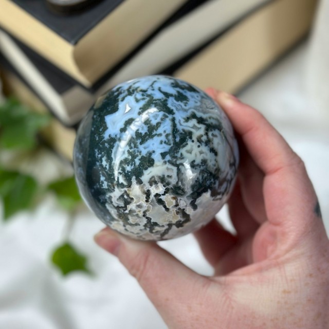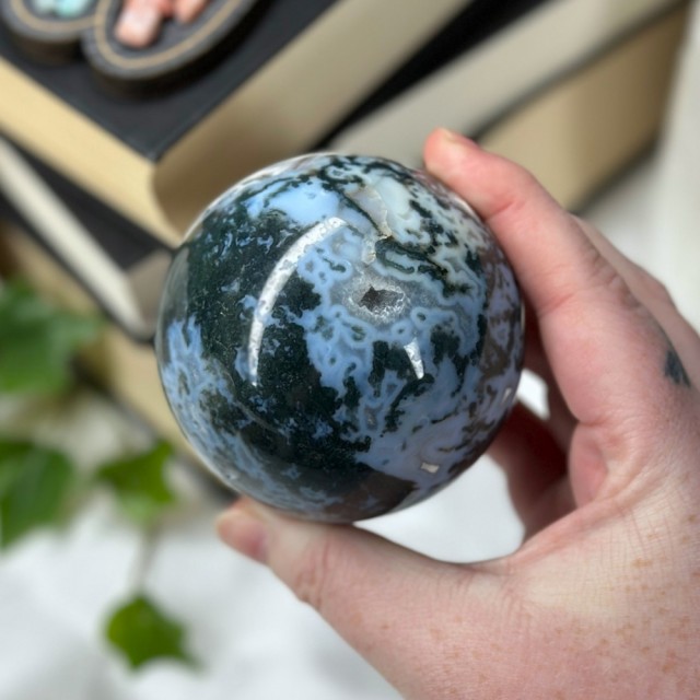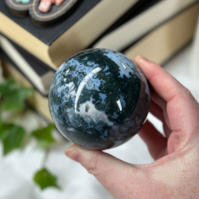 Små Mose Agat kuler på 2cm. Prisen er per stk og det vil bli tilfeldig plukket ut til deg. Alle disse er ganske mørke i fargen.