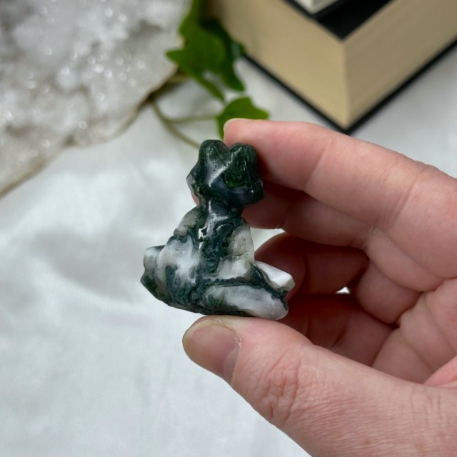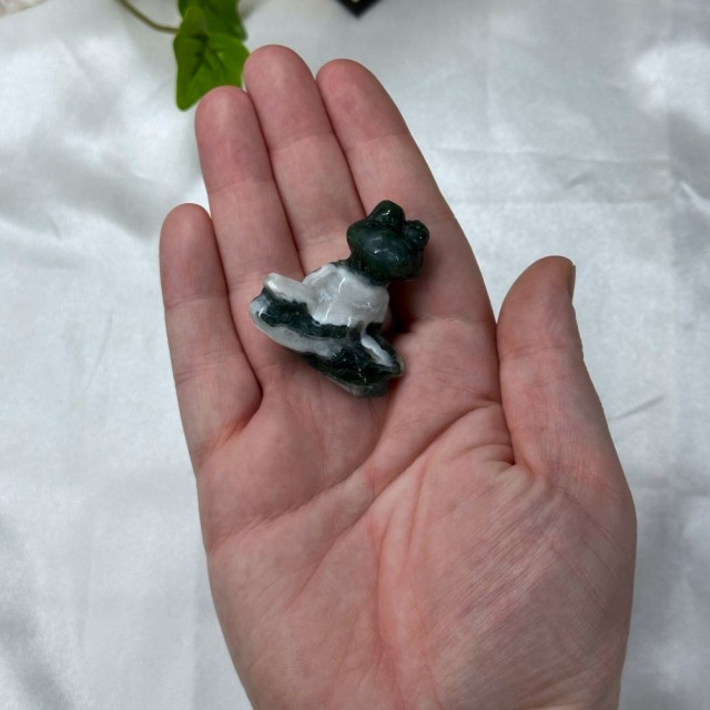 Kjempe søt krystall mini figur utskjæret som en Dinosaur i Mose Agat! Disse er så fine og ha i samlingen sin! Prisen er per stk.