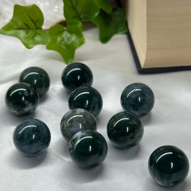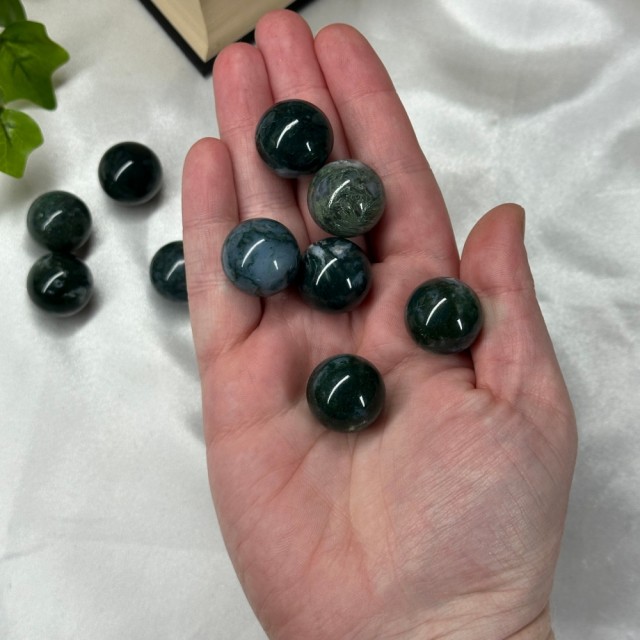 Små Mose Agat kuler på 2cm. Prisen er per stk og det vil bli tilfeldig plukket ut til deg. Alle disse er ganske mørke i fargen.