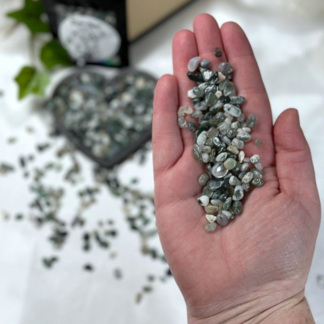 Mose Agat tromlet stein. Disse er ca 2,5-3cm store. Naturlige små merker forekommer. Disse blir tilfeldig plukket ut og størrelsen varierer.
