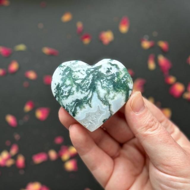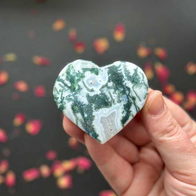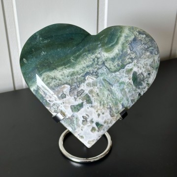 Mose Agat hjerte på 130g og har målene 5,5x6,5x2,6cm. Denne er litt redusert i pris pga litt skeiv utskjæring på hjertet. Det er den på bildet/bildene du får hvis du bestiller denne.