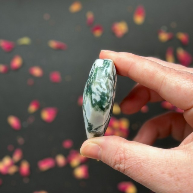Mose Agat tromlet stein. Disse er ca 2,5-3cm store. Naturlige små merker forekommer. Disse blir tilfeldig plukket ut og størrelsen varierer.