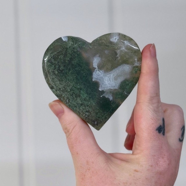 Som en levende bit av Moder Jord forbinder Mose Agat deg til naturens rytmer. Den sprer velstand, ro og harmoni - rett og slett som en skogstur i krystallform. Dette hjertet er 7,9x7,6x1,3cm og veier ca 141,6g.