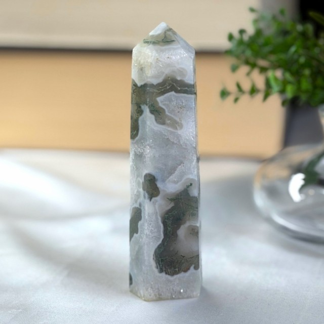 Mose Agat er en krystall som føles som naturens egen stemme.. rolig, helbredende og alltid til stede. Den har lenge vært sett på som en lykkebringer og en vokter av naturens krefter. Mange tror den fremmer vekst og velstand, ikke bare for mennesker, men også for planter. Legger du Mose Agat i nærheten av blomster, sies det at de spirer og blomstrer enda rikere.