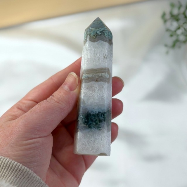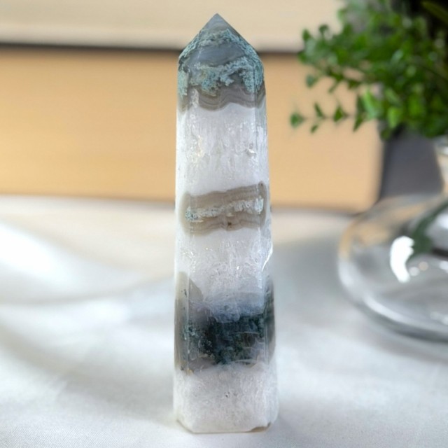 Som en levende bit av Moder Jord forbinder Mose Agat deg til naturens rytmer. Den sprer velstand, ro og harmoni. Rett og slett som en magisk skogstur i krystallform. Dette tårnet er 11,2cm og veier ca 144,7g. Står bittelitt skeivt.
