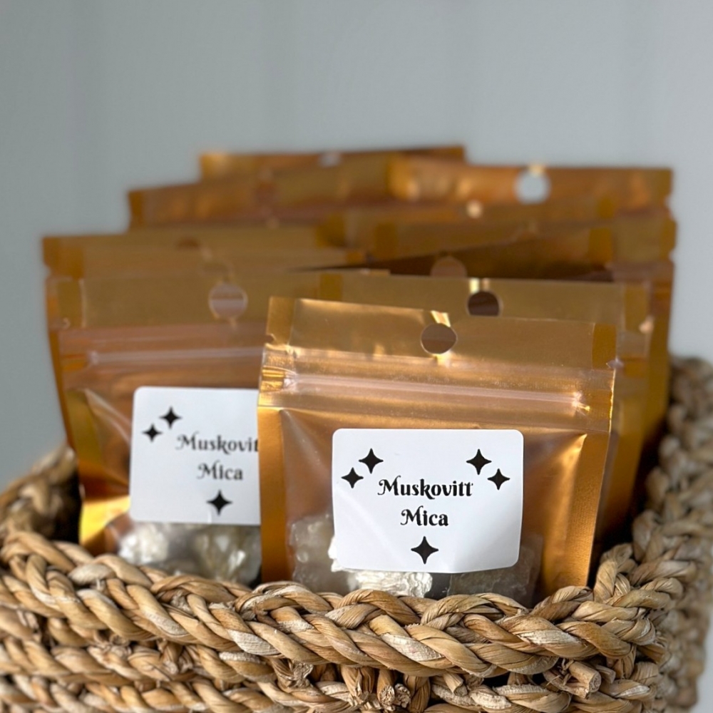 Muskovitt mica flak i pose. Muskovitt er en kraftig krystall for sinnet. Den fremmer klar tenkning, problemløsning og dyp syntese av kompleks informasjon. Mer informasjon finner du nedenfor.