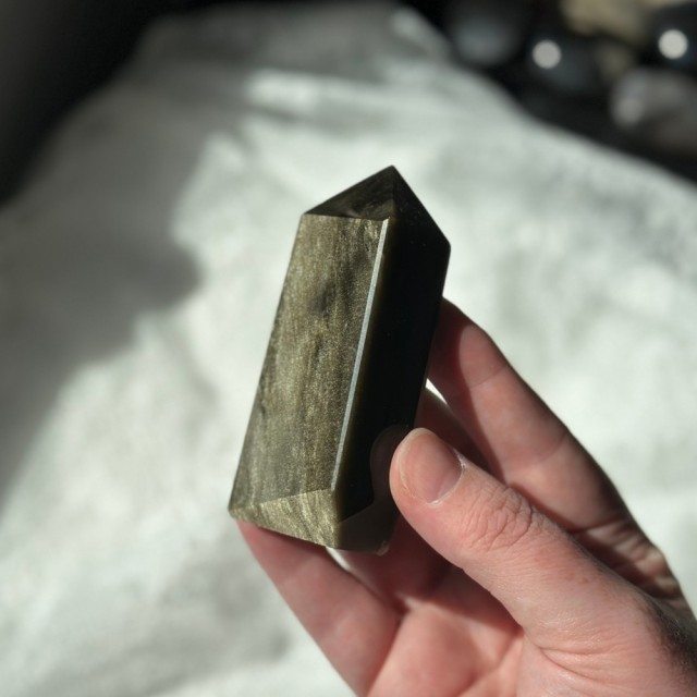 Gold Sheen Obsidian skjerper instinktene våre og avslører skjulte talenter. Den er spesielt godt å jobbe med når vi prøver å finne ut "vår hensikt" med livet og hvordan vi skal gå frem for å leve det. Den minner oss om at vi er herrene over vår egen skjebne og at vi har intelligensen og hjertet som trengs for å gjøre drømmene våre til virkelighet. Gold Sheen Obsidian hjelper oss til å tenke fornuftig og metodisk og til å planlegge effektivt når vi streber etter våre høyeste og største mål.